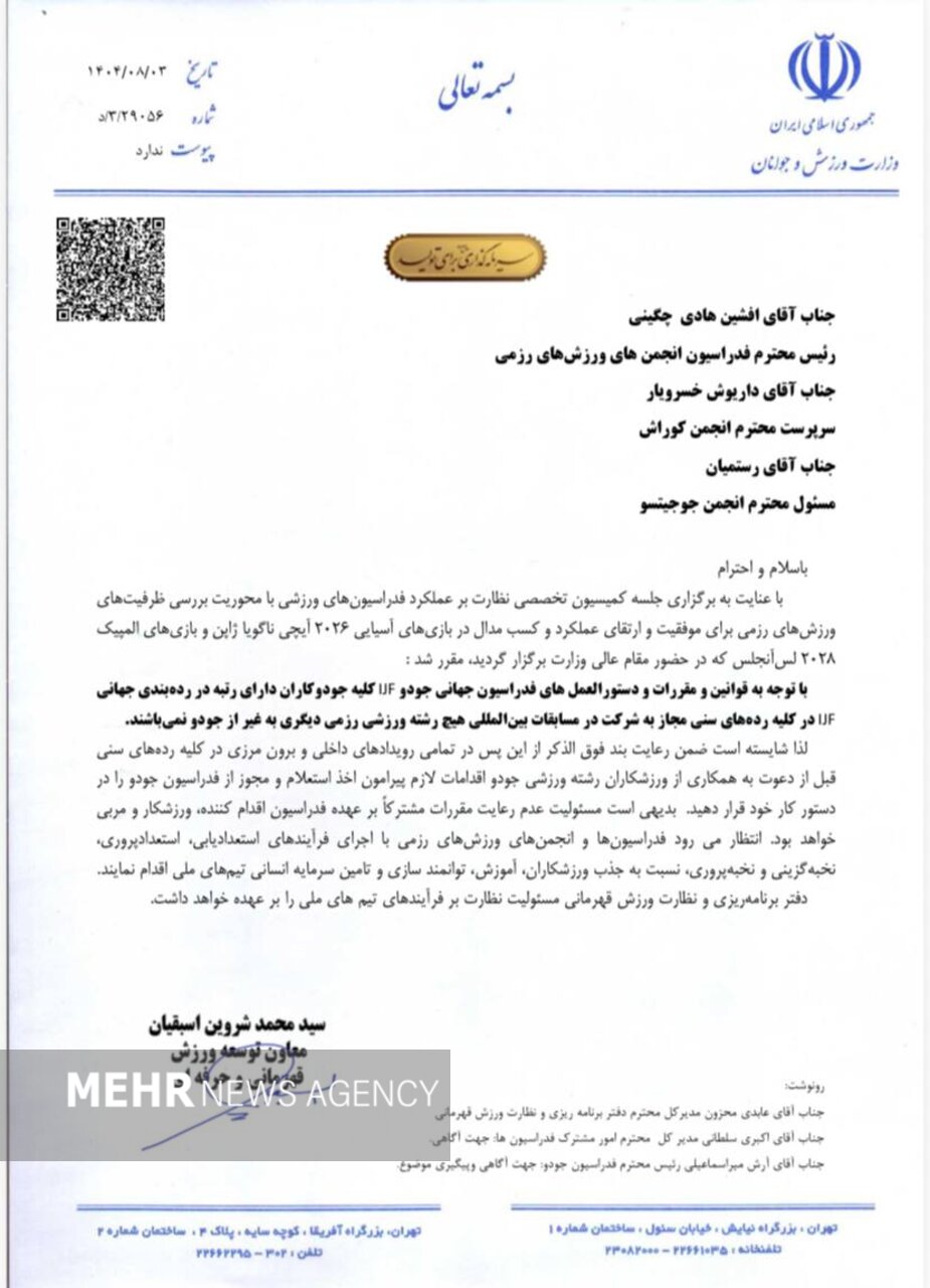 به گزارش خبرگزاری مهر، پس از آن که برخی جودوکاران با حضور در رشته های رزمی دیگر از ترکیب تیم های ملی جودو دور ماندن و این موضوع حواشی را ایجاد کرد، وزارت ورزش و جوانان با برگزاری جلسات تخصصی و با هدف موفقیت ورزش ایران در بازیهای آسیایی ۲۰۲۶ آیچی ناگویا و المپیک ۲۰۲۸ لس آنجلس، طی بخشنامه ای حضور جودوکاران در رشته های رزمی دیگر را ممنوع کرد.