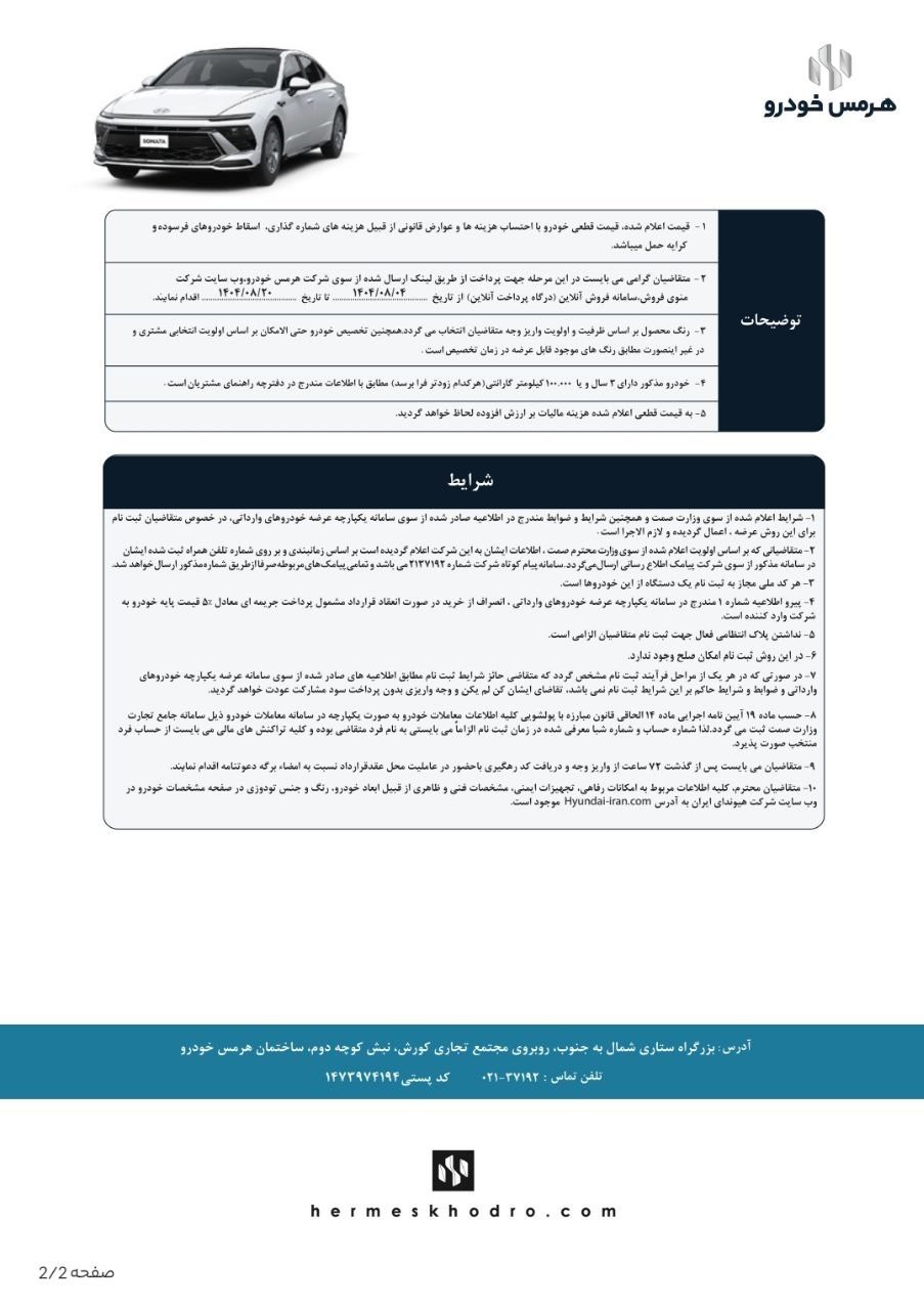 اقتصاد ایران: عصر خودرو- شرکت هرمس خودرو طی اطلاعیه ای با اعلام قیمت قطعی هیوندای سوناتا مدل ۲۰۲۵ به مبلغ ۳.۷۹۱ میلیارد (بدون احتساب مالیات بر ارزش افزوده) بخشنامه سری دوم تکمیل وجه خودرو هیوندای سوناتا ویژه منتخبین عرضه اسفند ماه سامانه خودروهای وارداتی با تحویل ۱۲۰ روز کاری را صادر کرد. طی این بخشنامه پرداخت به صورت سه مرحله ای است و پرداخت مرحله سوم در زمان صدور دعوتنامه انجام میشود.