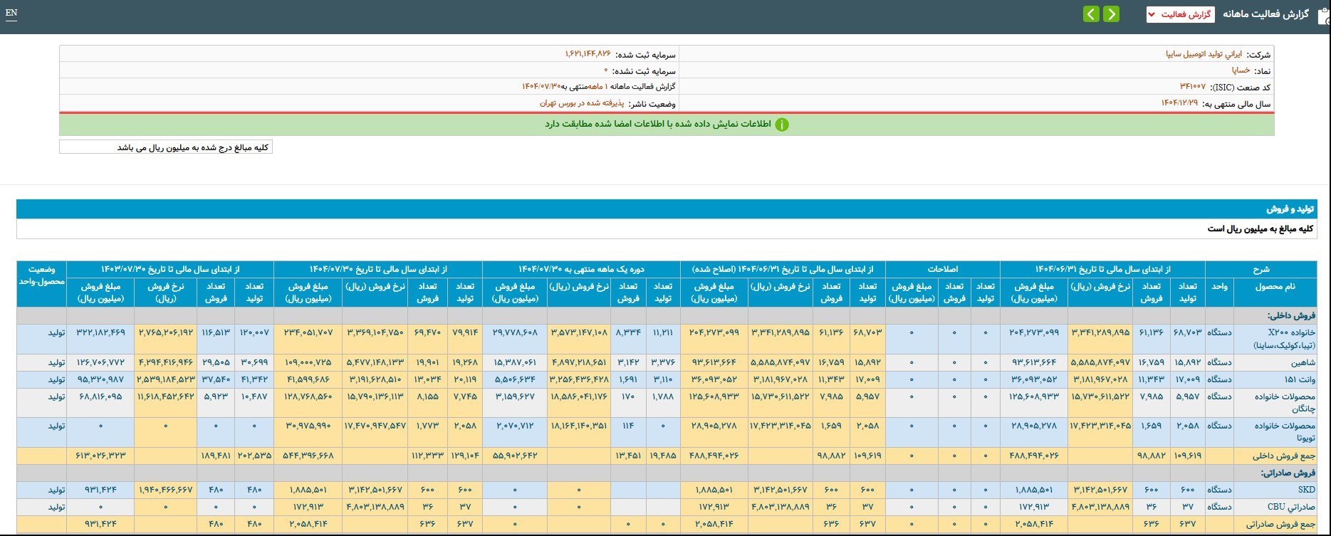 بررسی وضعیت این شرکت خودرویی در سامانه کدال نشان می دهد که در هفت ماه امسال گروه X 200 (تیبا، کوئیک، ساینا) 79 هزار و 914 دستگاه، خودروی شاهین 19هزار و 268 دستگاه، چانگان هفت هزار و 745 دستگاه و محصولات خانواده تویوتا 2 هزار و 58 دستگاه تولید شده است.