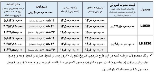 به گزارش پایگاه خبری «عصر خودرو» به نقل از ایکوپرس، در طرح فروش کامیون‌های مدل‌های L2630 و LK2630، L1930,Lk1930 محصولات با قیمت قطعی و همراه با تخفیف ویژه و شرایط پرداخت مرحله‌ای عرضه می‌شوند.