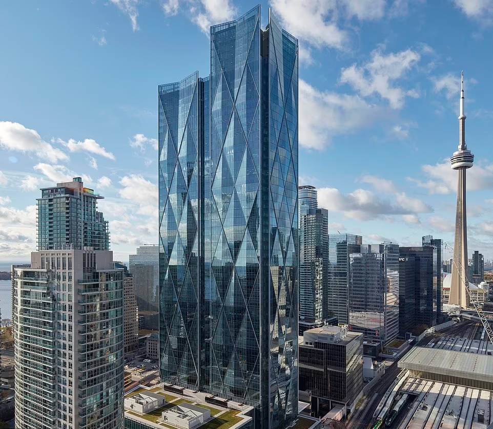 ۱۰. تورنتو، کانادا: این ساختمان ۲۴۱ متری دارای نمای بیرونی پوشیده از برش های الماسی شکل از شیشه های آبی است که نور خورشید را منعکس می کند.