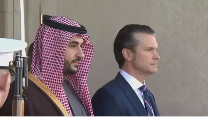 در تصاویری که این شبکه خبری منتشر کرد، نشان میدهد که بن سلمان در وزارت دفاع آمریکا (پنتاگون) مورد استقبال هگست قرار گرفت.