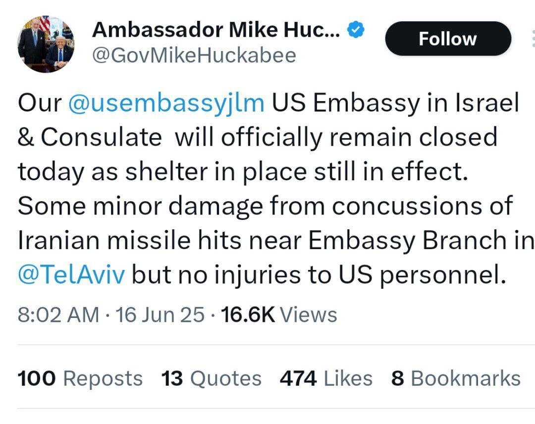 هاکابی سندرز، سفیر آمریکا در اسرائیل در شبکه اجتماعی ایکس نوشت: سفارت آمریکا در اسرائیل و کنسولگری ما در اورشلیم به طور رسمی تعطیل خواهند ماند. زیرا دستور ماندن در پناهگاه همچنان برقرار است.