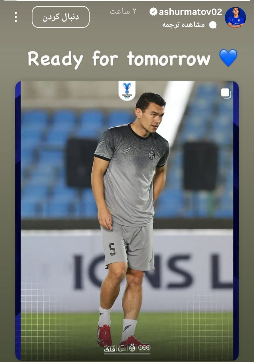 رستم آشورماتوف بازیکن ازبکستانی استقلال که در اردوی ترکیه آسیب دید و به خاطر آن هنوز نتوانسته در هیچ مسابقه رسمی برای آبیپوشان به میدان برود،دقایقی قبل عکسی از خود در فضای مجازی منتشر کرد و با صراحت نوشت: "آماده برای بازی فردا."