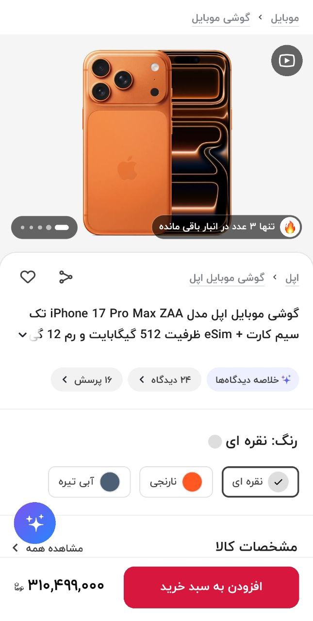 قیمت آیفون ۱۷پرومکس در فروشگاههای اینترنتی ایران