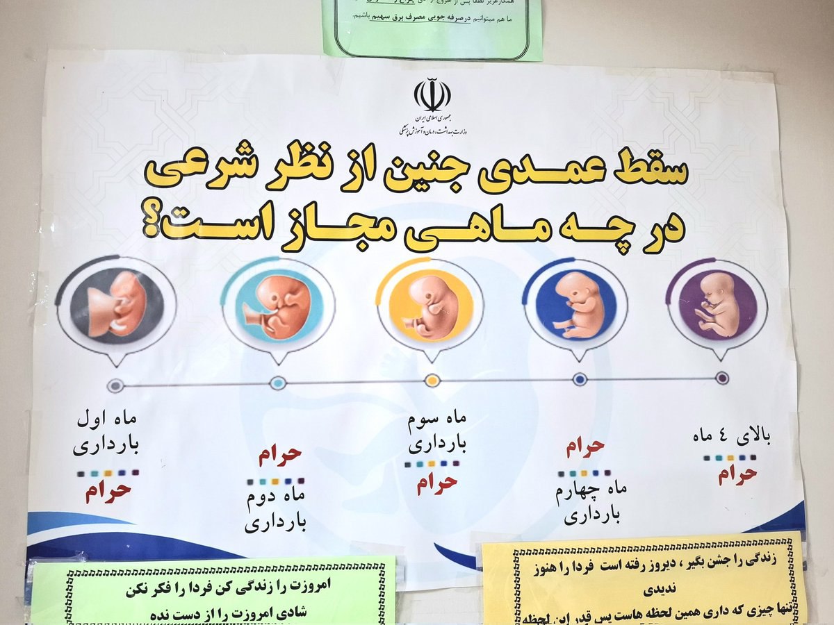 در یکی از مراکز بهداشت، بنری نصب شده که به موضوع حکم سقط عمدی جنین در ماه‌های بارداری می‌پردازد و توجه مردم را جلب کرده است. این بنر که به صورت یک اینفوگرافیک طراحی شده، برخلاف انتظار، اطلاعات جامع و روشنی به شهروندان منتقل نمی‌کند و تنها حکم سقط جنین را از ماه اول تا چهارم بارداری توضیح می‌دهد.