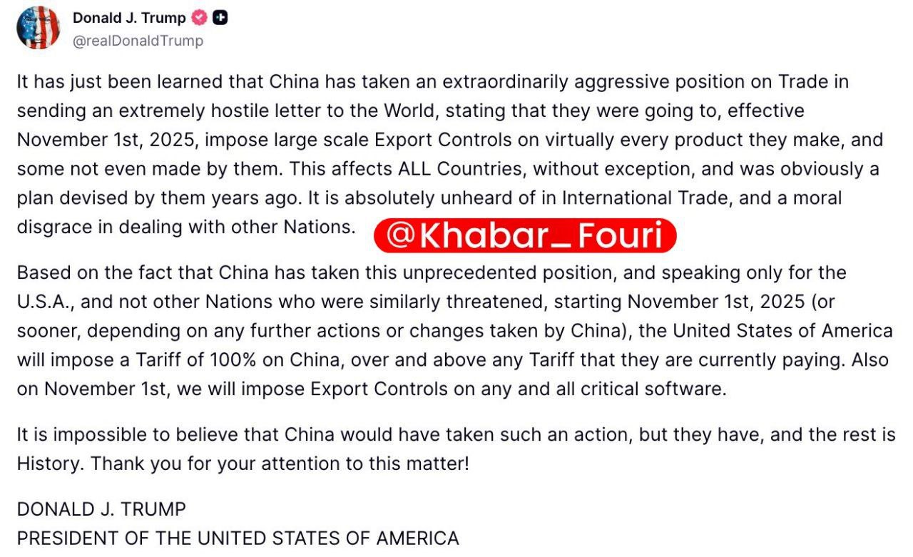 ترامپ روز جمعه در پستی در شبکه اجتماعی تروث سوشال نوشت: به‌تازگی مطلع شده‌ایم که چین با ارسال نامه‌ای به‌شدت خصمانه به جهان، موضعی فوق‌العاده تهاجمی در قبال تجارت اتخاذ کرده و اعلام کرده که از اول نوامبر ۲۰۲۵، کنترل‌های صادراتی گسترده‌ای را تقریبا بر هر محصولی که تولید می‌کند و برخی کالاهایی که تولید نکرده، اعمال خواهد کرد.