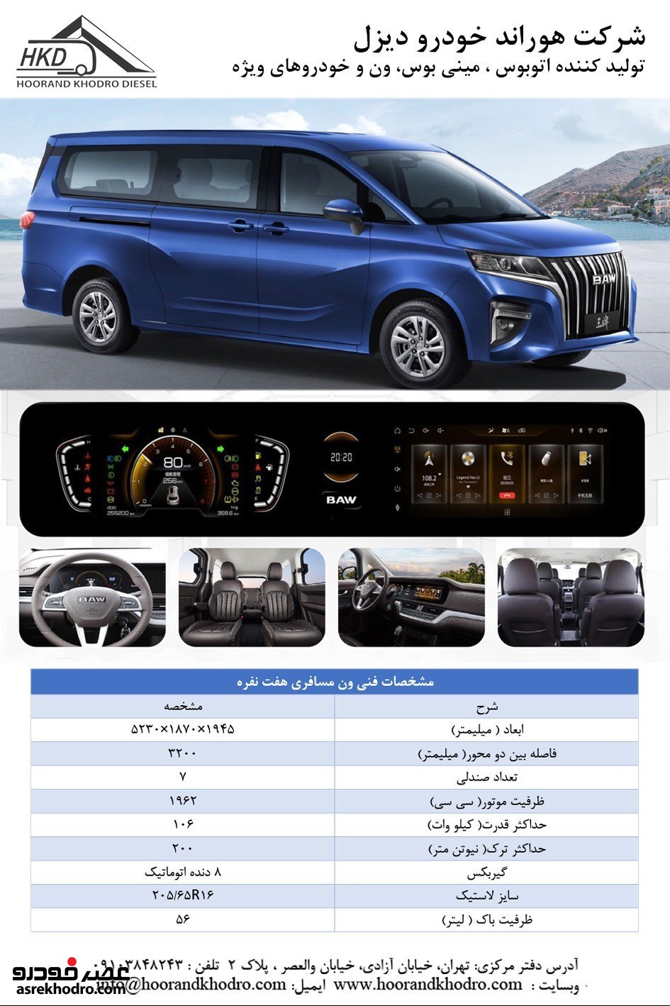شرکت هوراند خودرو دیزل، با سابقه در واردات و مونتاژ خودروهای تجاری، نسخه Long Wheelbase ون 7 نفره BAW را به ایران میآورد. این مدل با ابعاد 5220×1870×1945 میلیمتر، فاصله محوری 3200 میلیمتر، موتور 1962 سیسی (106 کیلووات قدرت، 200 نیوتنمتر گشتاور)، گیربکس 8 دنده اتوماتیک، لاستیک 205/65R16 و باک 56 لیتری، گزینهای جادار و قدرتمند برای بازار ایران است. عرضه در 1404، با تمرکز بر گردشگری و حمل VIP، میتواند جایگزینی چینی برای ونهای گران اروپایی باشد و با صرفهجویی سوخت، سطح دسترسی به MPVهای مدرن را افزایش دهد.
