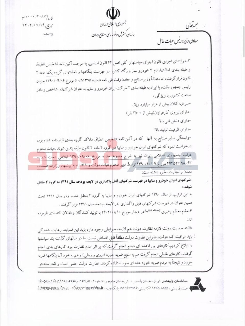 علاوه بر این، نامه به تغییر طبقهبندی ایران خودرو و سایپا در سال 1380 اشاره دارد. در آن زمان، وزیر وقت صنایع و معادن با توجه به ویژگیهای این دو شرکت، از جمله سرمایه کلان، نیروی کار گسترده، دانش فنی بالا، ظرفیت تولید قابلتوجه و وابستگی سایر صنایع به آنها، خواستار انتقال آنها از گروه یک به گروه دو شرکتهای مشمول واگذاری شد. این درخواست با مصوبه هیئت دولت در سال 1380 تأیید شد و از سال 1391، این دو خودروساز در فهرست شرکتهایی قرار گرفتند که به دلیل اهمیت استراتژیک، واگذاری کامل سهام آنها مجاز نیست.