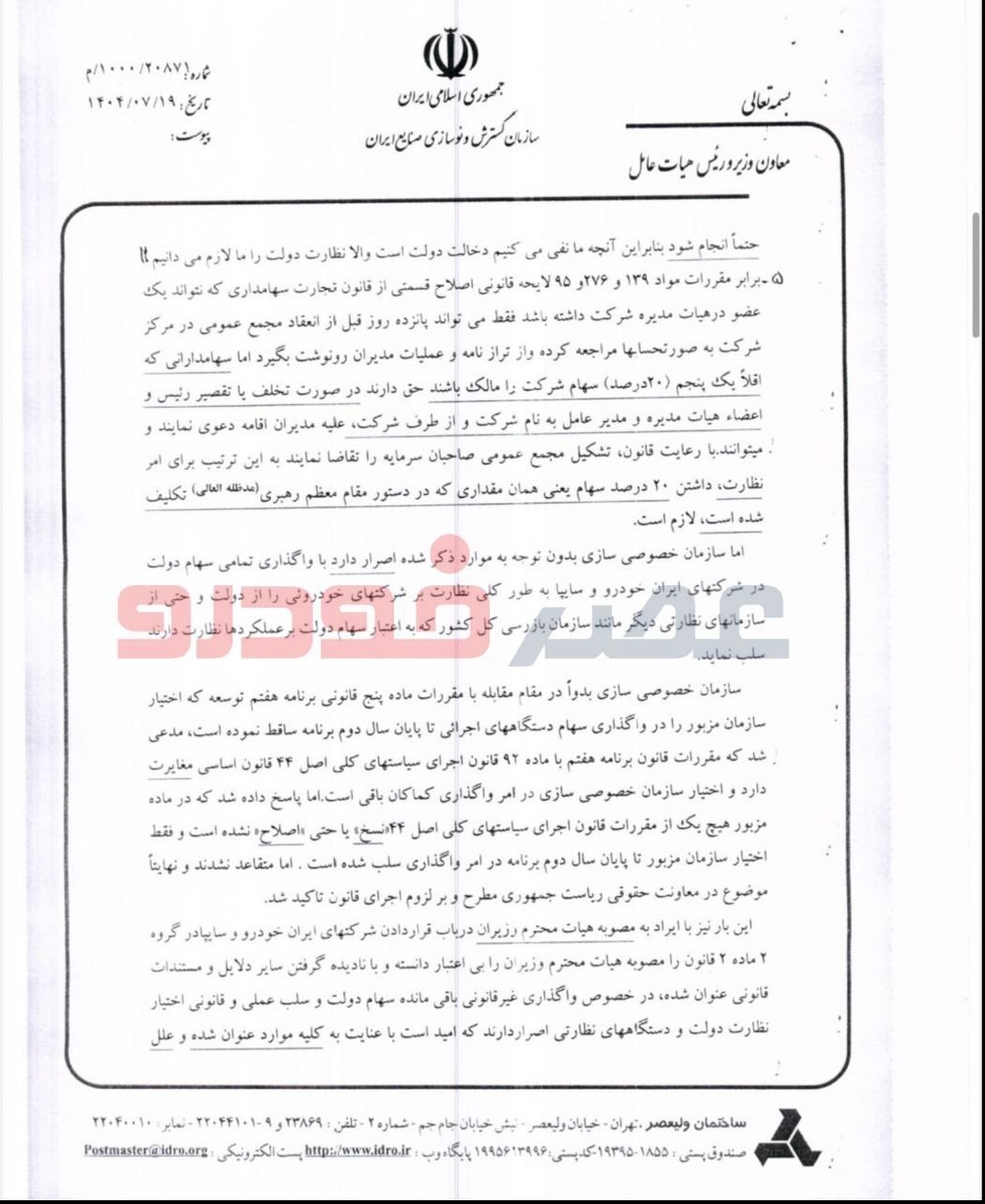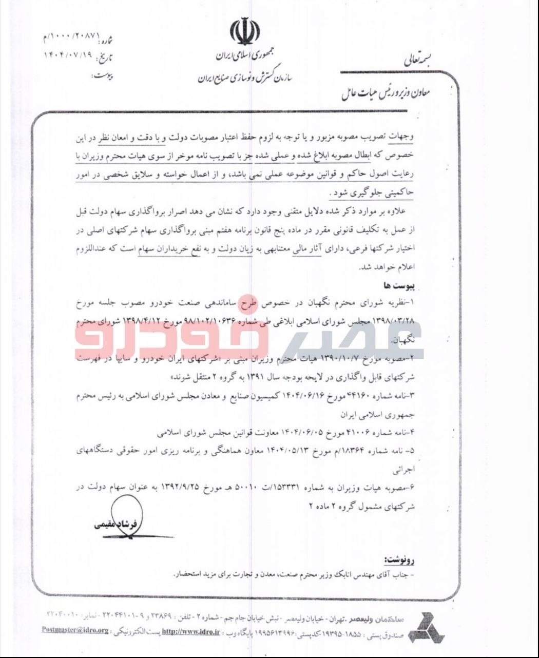 اقتصاد ایران: عصر خودرو- سازمان گسترش و نوسازی صنایع ایران (ایدرو) در نامهای رسمی به دبیر هیئت دولت، با استناد به قوانین بالادستی، نظرات شورای نگهبان و تأکیدات مقام معظم رهبری، خواستار حذف مصوبه واگذاری باقیمانده سهام دولت در شرکتهای ایران خودرو و سایپا شد. این نامه که از سوی فرشاد مقیمی، معاون وزیر و رئیس هیئت عامل ایدرو، خطاب به دکتر تقوینژاد نوشته شده، با ارائه استدلالهای حقوقی و قانونی، بر ممنوعیت واگذاری سهام اقلیتی دولت در این دو خودروساز بزرگ تأکید کرده و هشدار داده که چنین اقدامی میتواند نظارت دولت بر این صنایع استراتژیک را سلب کند.
