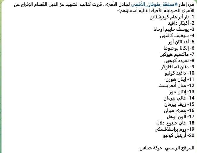 به گزارش خبرگزاری مهر به نقل از الجزیره، گردانهای قسام اعلام کردند که در چارچوب توافق تبادل اسرا تصمیم گرفتهاند ۲۰ اسیر زنده صهیونیست را آزاد کنند.
