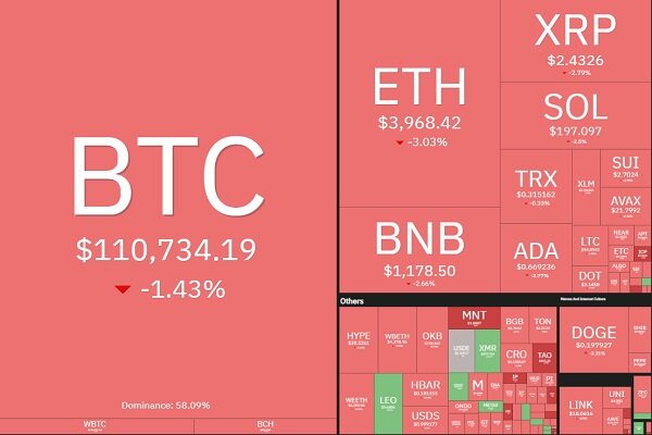 بیتکوین با افت ۲ هزار و ۲۶۳ دلار به سطح ۱۱۰ هزار و ۸۴۰ دلار رسید و کاهش ۲ درصدی را ثبت کرد. اتریوم نیز ۳.۳۸ درصد افت داشت و در نرخ ۳ هزار و ۹۸۵ دلار ایستاد.