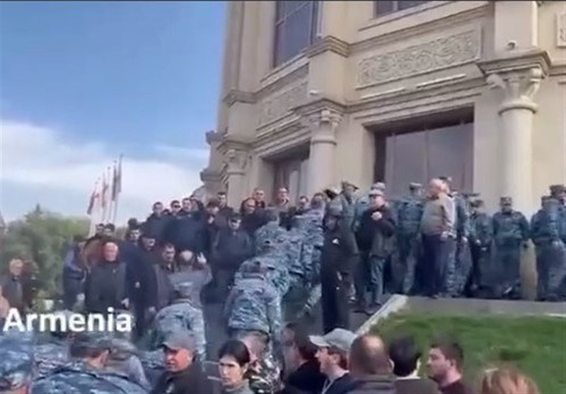 تجمع نیروهای امنیتی و معترضان در مقابل شهرداری گیومری ارمنستان