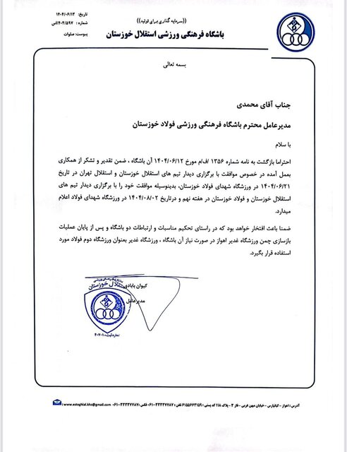 «ضمن تقدیر و تشکر از همکاری به عمل آمده در خصوص موافقت با برگزاری دیدار تیمهای استقلال خوزستان و استقلال تهران در ورزشگاه شهدای فولاد خوزستان بدین وسیله موافقت خود را با برگزاری دیدار تیمهای استقلال خوزستان و فولاد خوزستان در هفته نهم در ورزشگاه شهدای فولاد اعلام میدارد.