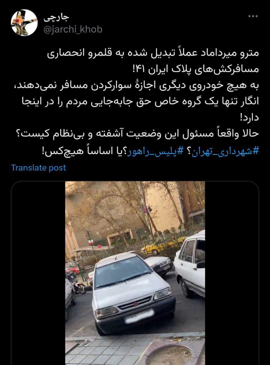 برترینها: همه چیز از یک توئیت وایرال شده آغاز شد. ویدیویی که در فضای مجازی منتشر شده، شرایط مقابل متروی میرداماد را نشان میدهد؛ جایی که گروهی از مسافرکشهای پلاک ۴۱، منطقه را عملاً قرق کرده و اجازهٔ کار به خودروهای دیگر را نمیدهند.