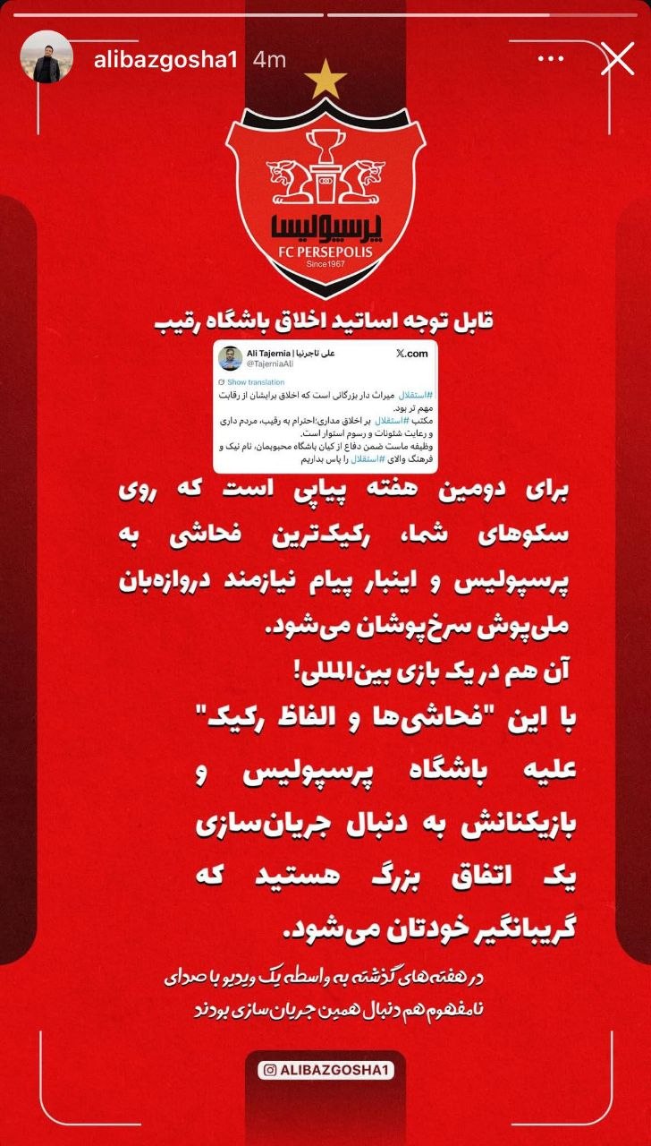 در همین بین علی بازگشا مدیر روابط عمومی باشگاه پرسپولیس استوری منتشر کرد و گفت: