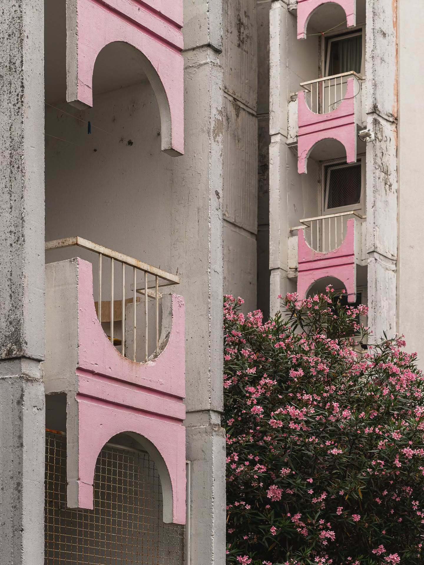 جزئیات صورتی در نمای این خوابگاه جلب توجه می‌کند