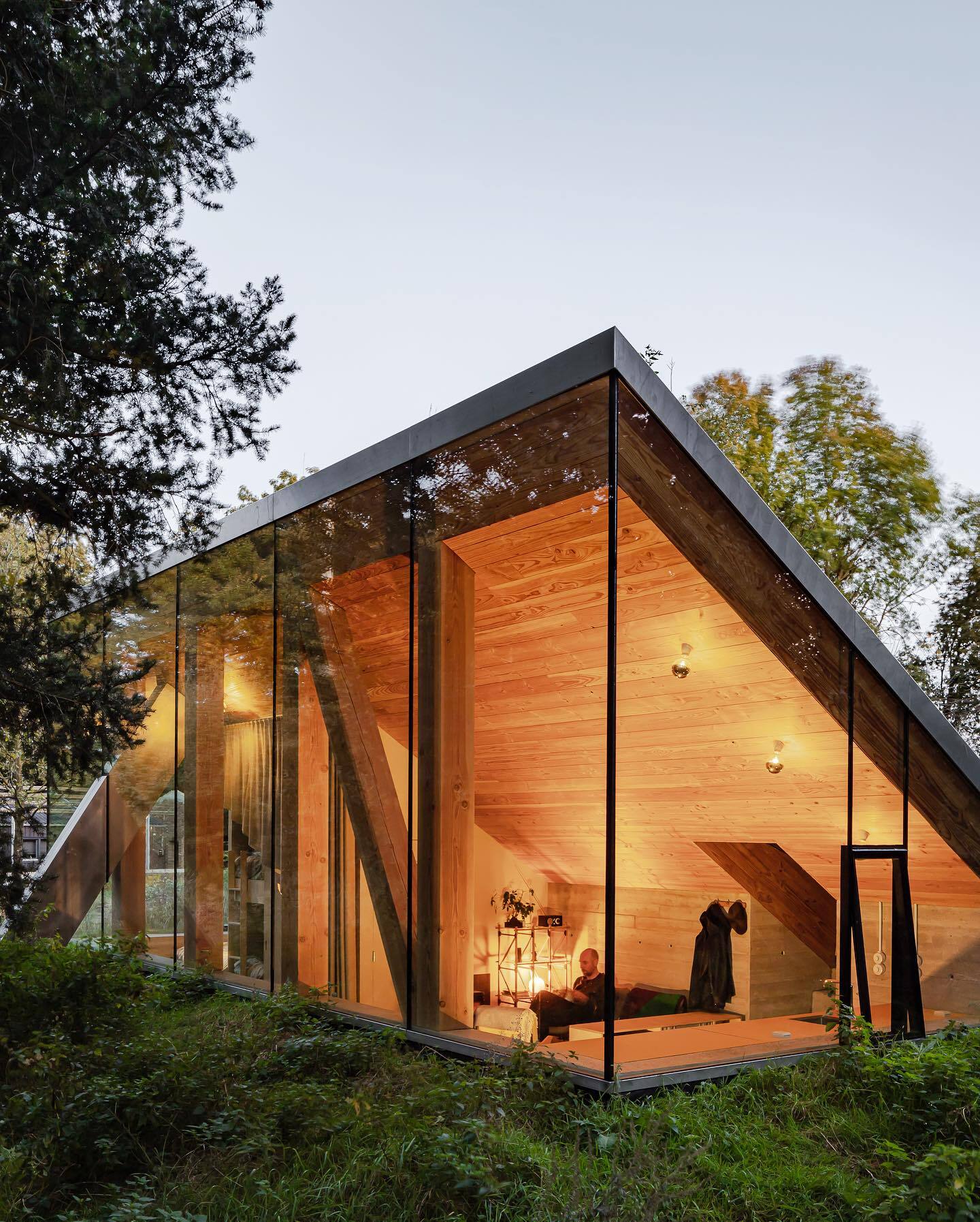 یک ستون شیبدار به شکل منحصر به فردی از میان سقف سبز عبور کرده و علاوه بر نقش سازهای، فضاهایی برای لانهسازی پرندگان و خفاشها ایجاد میکند. این عنصر به بهترین شکل ممکن، معماری را با طبیعت پیوند میزند و مفهوم زندگی کوچک و سازگار با محیط زیست را به نمایش میگذارد.