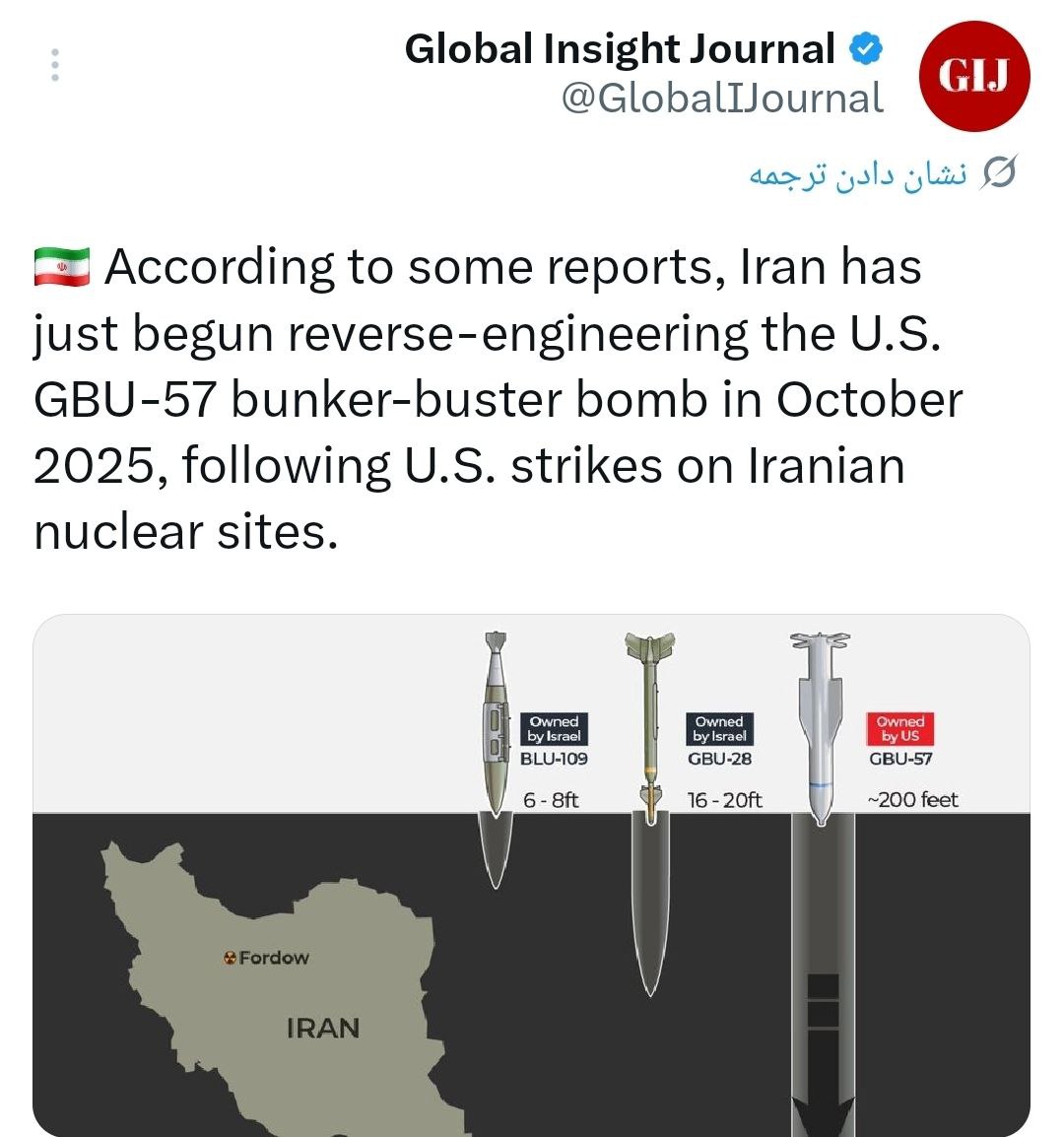 اقتصاد ایران: بر اساس برخی گزارشها، ایران از اکتبر ۲۰۲۵ و در پی حملات آمریکا به تأسیسات هستهای کشور، روند مهندسی معکوس بمب سنگرشکن GBU-۵۷ آمریکا را آغاز کرده است.