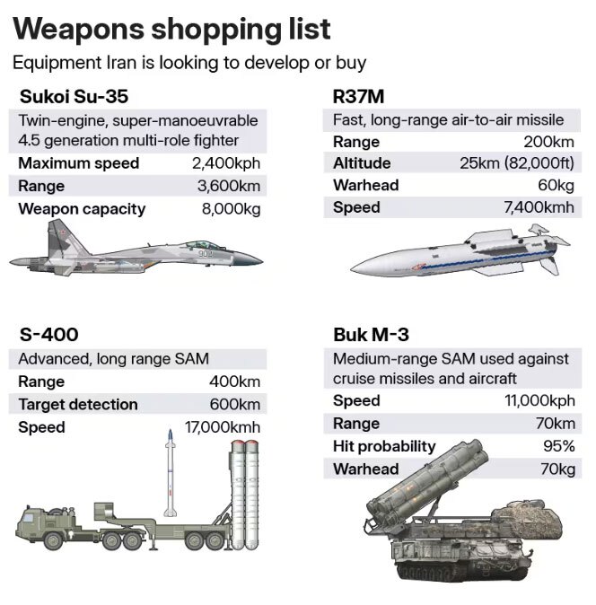 وی گفت ایران از خرید جنگندههای پیشرفته سوخو- ۳۵ و سیستمهای دفاع هوایی پیشرفته و همچنین فناوری های روسی برای افزایش قابل توجه دقت موشکهای بالستیک خود سود خواهد برد.