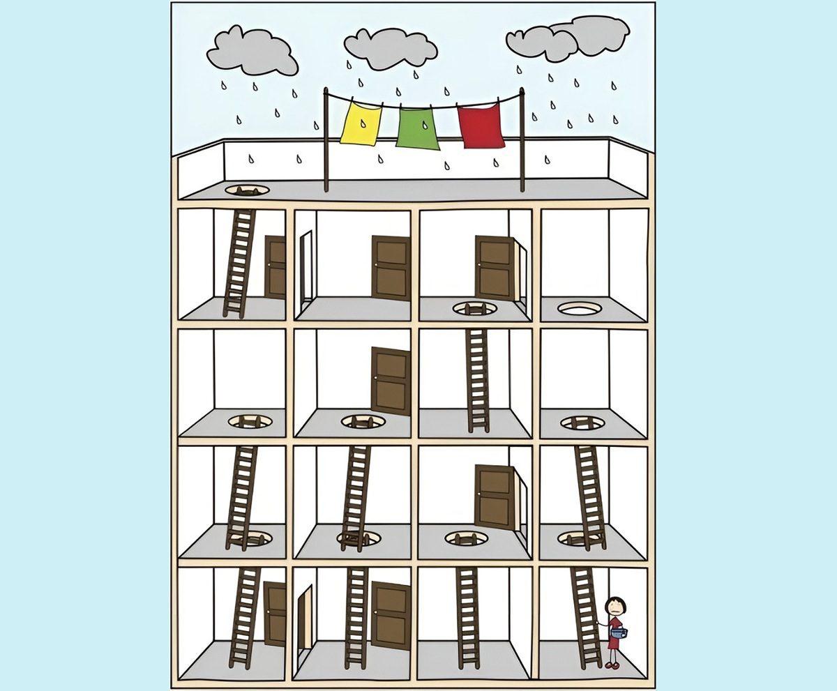 به پازل تصویری پایین خوب نگاه کنید. یک تصویر از ساختمان چند طبقه را نشان می دهد که دارای پله هایی از طبقه ای به طبقه دیگر و درهایی است که اتاق های مختلف را به هم متصل می کند. در بالای ساختمان، یک پشت بام با بند رخت وجود دارد که در آن سه تکه لباس رنگارنگ – یکی زرد، یکی سبز و دیگری قرمز – در حالی که باران می بارد، آویزان شده است.