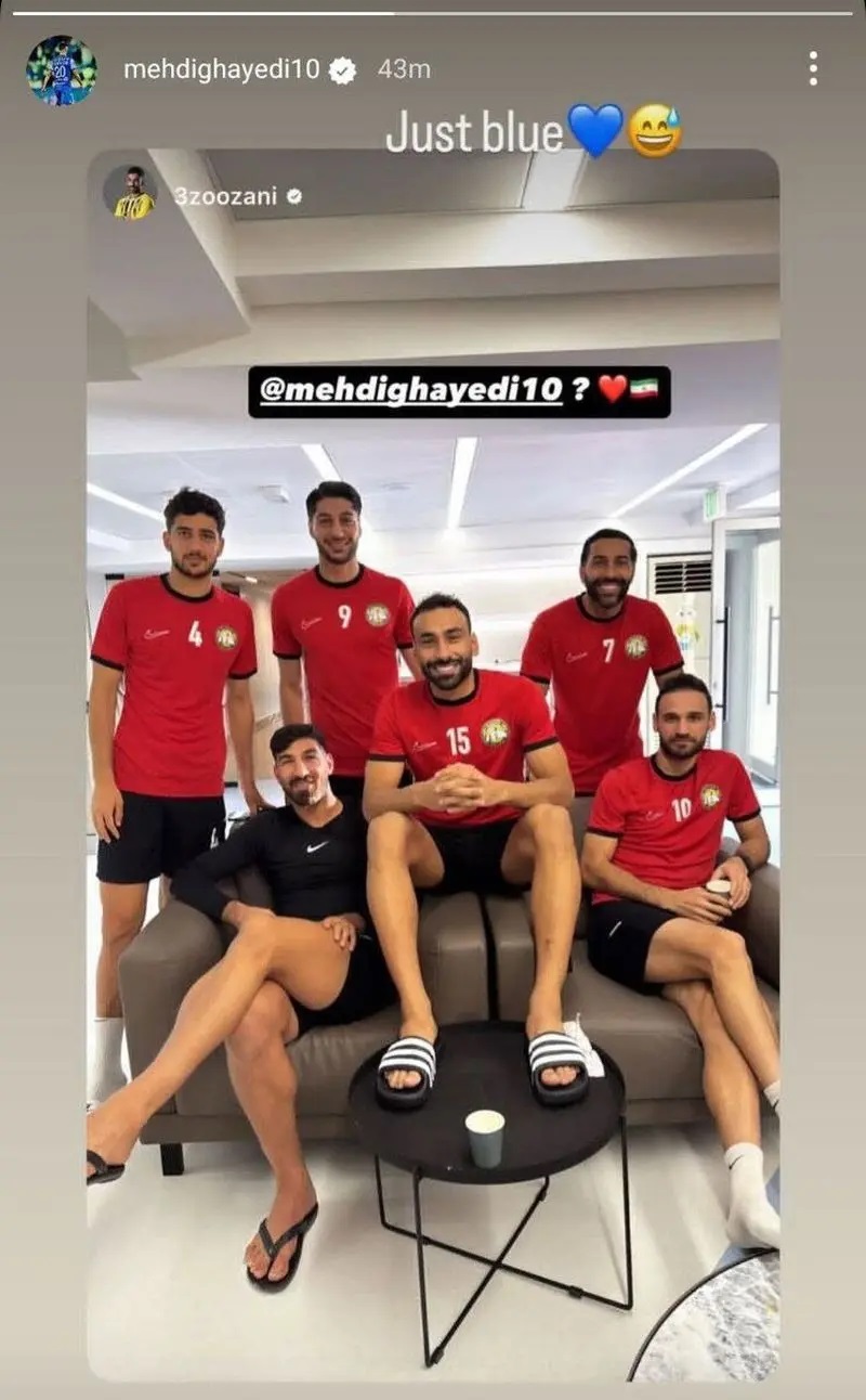 برترینها: عبدالعزیز حمد همبازی سابق مهدی قایدی در اتحاد کلبا یک عکس در کنار دیگر همبازیان ایرانی اش که همگی پیراهن قرمز به تن داشتند منتشر کرد. او زیرکانه قایدی را با یک قلب قرمز منشن کرد که ستاره ریز نقش پیشین استقلال هم همان استوری را بازنشر کرد و کنار یک قلب آبی نوشت: «فقط آبی» تا بدین ترتیب به استوری عبدالعزیز واکنش نشان بدهد.