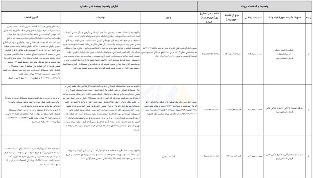8. وام 163.4 میلیارد تومانی برای فروش اقساطی برنج – شرکت معمار گستر دماوندبهگفته لیزینگ، سرقفلی ملک وثیقه تعیینتکلیف نشده و این شرکت نیز در روزنامه رسمی اعلام انحلال کرده است.