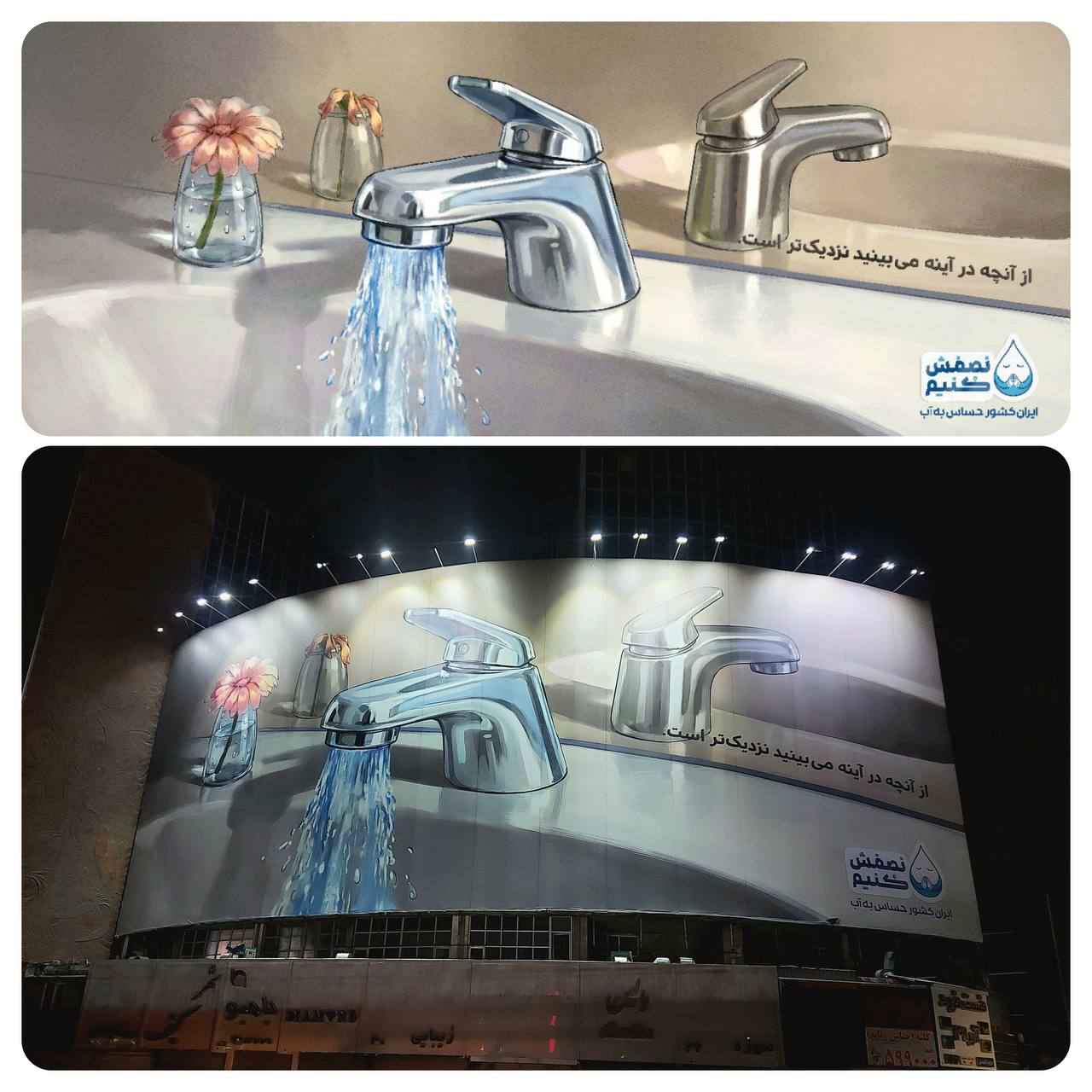 این دیوارنگاره که محصول خانه طراحان انقلاب اسلامی است، در ادامه پویش «ایران کشور حساس به آب» و صرفهجویی در مصرف آب است. دیوارنگاره «نصفش کنیم» طرحی از شیر آب است که مقابل آینه قرار گرفته و با توضیح کوتاه؛ «از آنچه در آینه میبینید نزدیکتر است» به مخاطبان هشدار میدهد.