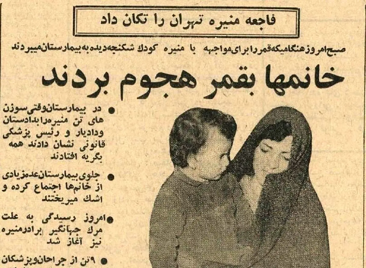 با معاینه بدن دختری ۲ ساله به نام منیر در بیمارستان پرده شکنجههای زن بابایی به نام قمر برداشته شد. قمر به دلیل حسادت به فرخنده- همسر سابق همسرش- منیر ۲ ساله را با فرو کردن ۱۴ سوزن شکنجه میکرده است. داستان این رویداد کم سابقه را از روزنامه اطلاعات ۹ آذر ۱۳۴۴ بخوانید و عکسها را تماشا کنید.