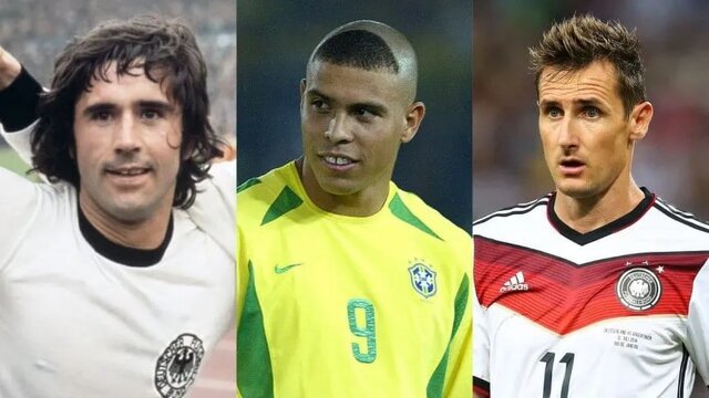 رونالدوی برزیلی با ۱۵ گل (۱۹۹۴، ۱۹۹۸، ۲۰۰۲ و ۲۰۰۶) دوم و گرد مولر با ۱۴ گل سوم است.