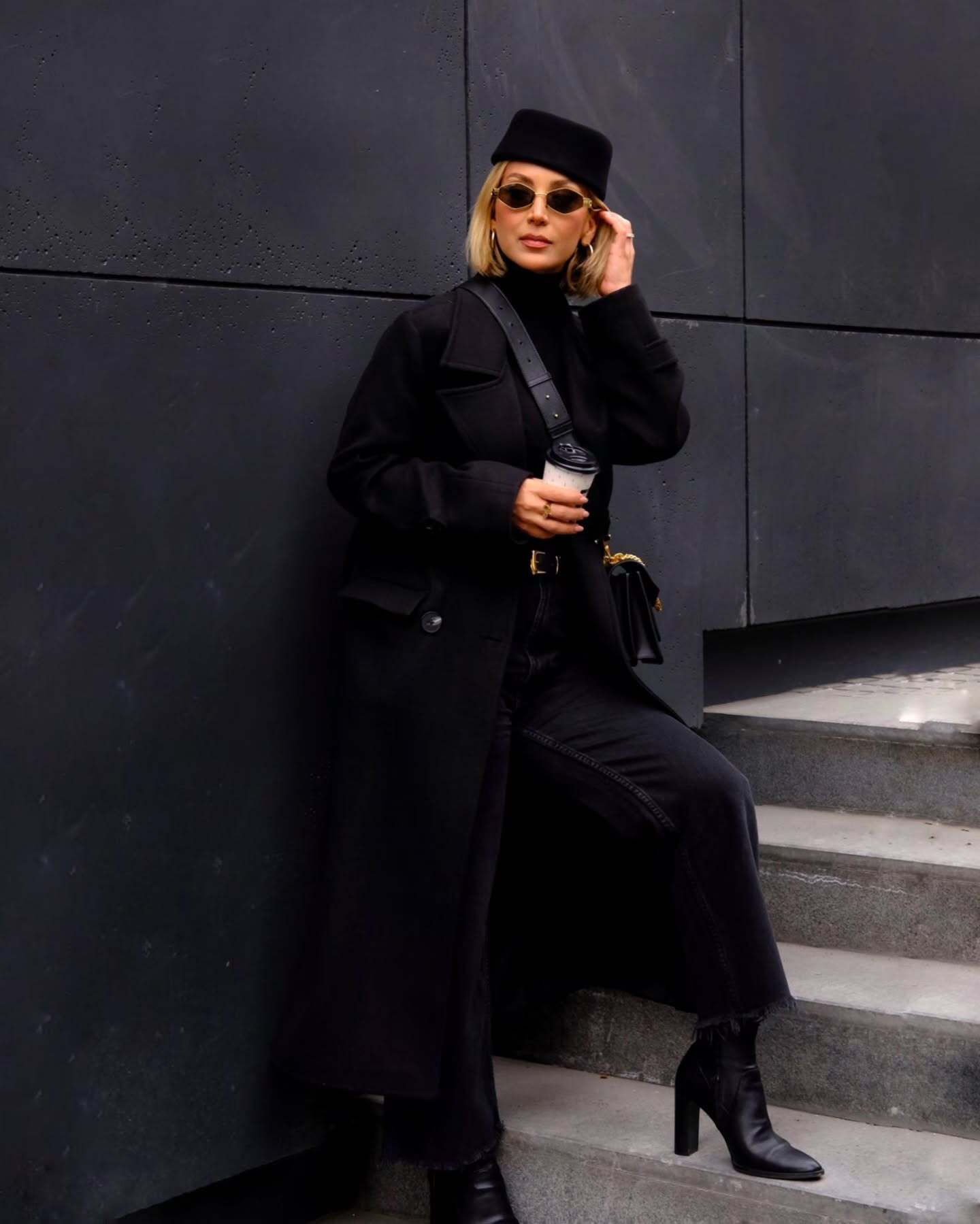 اقتصاد ایران: مینا مختاری با استایل تماممشکی و ترکیب کلاسیک پالتو، کلاه و اکسسوریهای مینیمال، جلوهای شیک و مدرن به خیابانهای شهر بخشید.