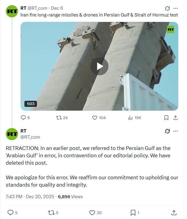 اقتصاد ایران: شبکه راشاتودی که در مطلب چند روز قبل خود از عبارت جعلی به جای «خلیج فارس» استفاده کرده بود، عذرخواهی و مطلب خود را اصلاح کرد.