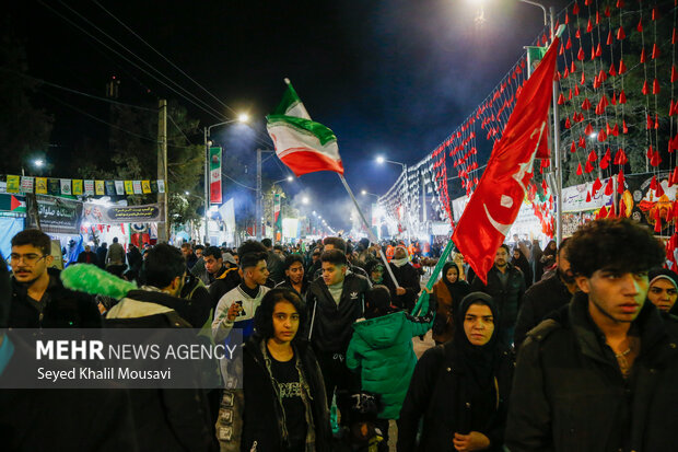 نوجوانان دهه نودی به عنوان خادمان داوطلب، با حضور عاشقانه خود، به زائران خدمت میرسانند و جلوهای زیبا از تداوم مکتب سلیمانی را نشان میدهند. در میان جمعیت، فریادهای "هیهات من الذله"، "مرگ بر آمریکا" و "مرگ بر اسرائیل" طنینانداز است، که نشاندهنده پیوند عمیق این مراسم با محور مقاومت و حمایت از مظلومان جهان، از جمله فلسطین، است.