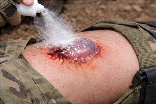 محققان مؤسسه پیشرفته علوم و فناوری کره جنوبی(KAIST) که یکی از آنها سرگرد ارتش است، در جستجوی راه حلی برای درمان چنین آسیبهایی، یک پودر تولید کردهاند که با کاتیونها (ذراتی با بار الکتریکی مثبت) مانند کلسیم در خون واکنش میدهد و تنها در یک ثانیه به حالت ژل تبدیل میشود و حتی زخمهای عمیق و نامنظم را فوری میبندد.