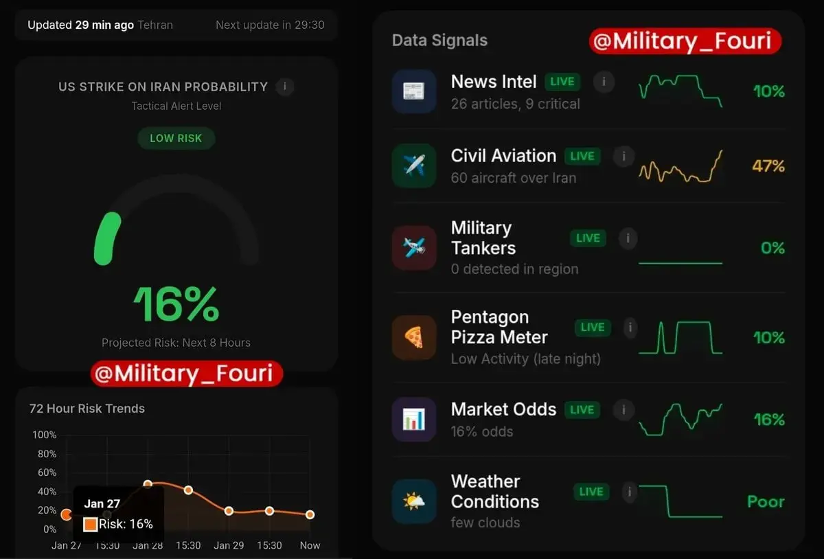 اقتصاد ایران: طبق دادههای راداری و سطح هشدار تاکتیکی، احتمال حمله ایالات متحده به ایران در حال حاضر ۱۶ درصد (Low Risk) ارزیابی شده است.