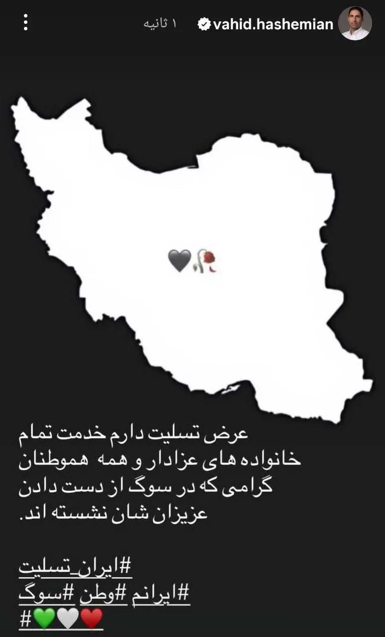 برترینها: در پی اتفاقات تلخ اخیر در کشور، وحید هاشیمیان، امید عالیشاه، مرتضی پورعلیگنجی، حسین ابرقویی هر کدام در پیامهای جداگانه به مردم داغدار ایران تسلیت گفتند.