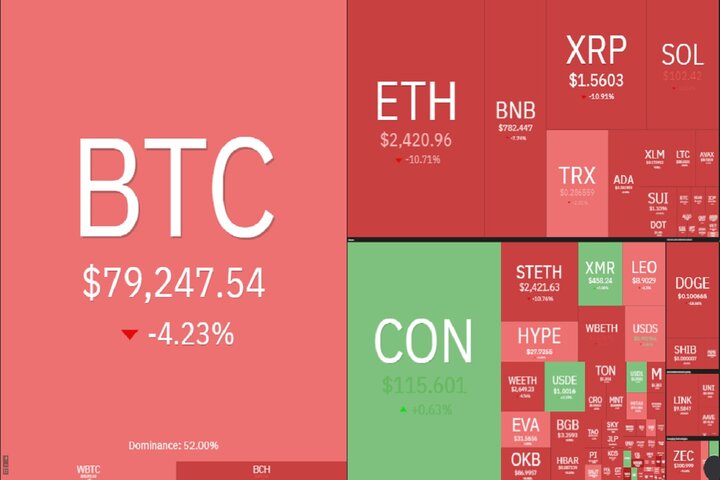 بیتکوین، بهعنوان لیدر بازار، با افت ۶.۱۴ درصدی به محدوده ۷۸ هزار دلار عقبنشینی کرد. کاهش بیش از ۵ هزار دلاری قیمت این رمزارز، سیگنال منفی قدرتمندی به بازار مخابره کرد و باعث شد سرمایهگذاران کوتاهمدت با شتاب بیشتری از بازار خارج شوند.