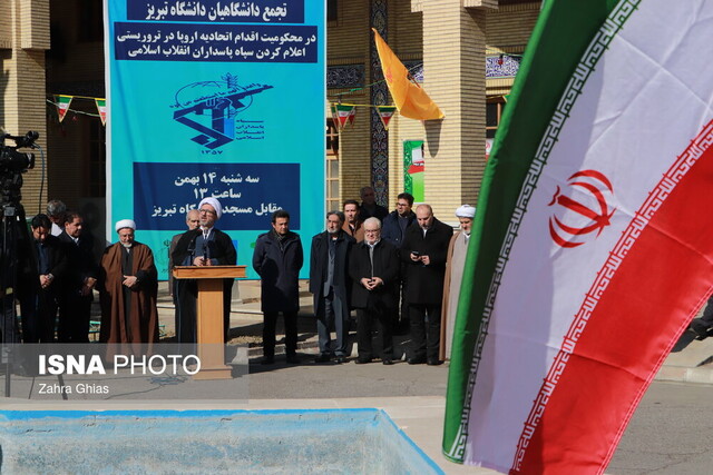 رئیس نهاد نمایندگی مقام معظم رهبری در دانشگاههای آذربایجان شرقی گفت: ما دانشگاهیان دانشگاه تبریز امروز اینجا جمع شدهایم تا اقدام نابخردانه اتحادیه اروپا را قاطعانه محکوم کنیم و اعلام کنیم این اقدام بیش از آنکه علیه سپاه باشد، به نفع تروریسم است. سپاه تا امروز سدی محکم در برابر تروریسم در منطقه بوده و تضعیف این سد، ناامنیهای آینده را به دنبال خواهد داشت که مسئولیت آن بر عهده همین تصمیمگیران نابخرد است.