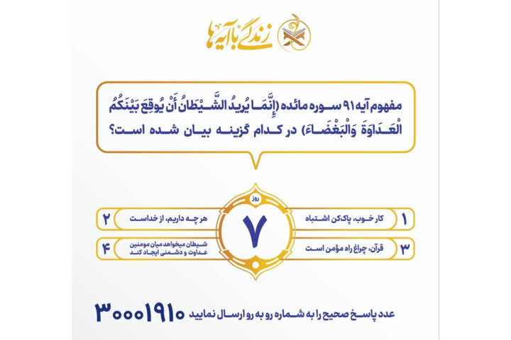 برای شرکت در پویش زندگی با آیه ها عدد ۵ را به سامانه پیامکی ۳۰۰۰۱۹۱۰ ارسال بفرمائید.