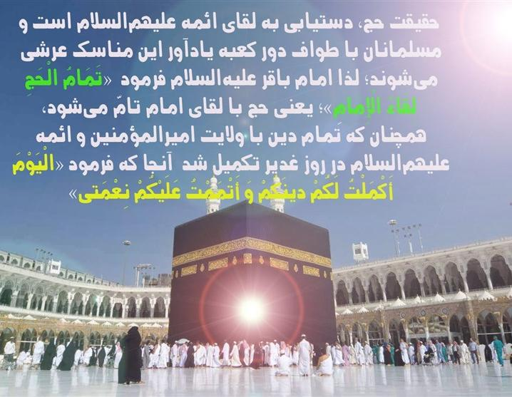 در عرش، انوار شیعیان عترت حول انوار مقدس ایشان گشتند و این عمل را میلیونها سال ادامه دادند.3 با علم و معرفت به این نکته که اهل بیت علیهمالسلام از جانب خداوند صاحبان عرشند و از آنجا امور را تدبیر میکنند، لذا «مدبرات امر» شناخته میشوند و با علم به اینکه طبق روایاتمان، پاکطینتان حول انوار مقدس ایشان در عرش طواف میکردند و با توجه به نمادین بودن کعبه نسبت به عرش خدا، در مییابیم حقیقت حج، دستیابی به لقای ائمه علیهمالسلام است و مسلمانان با طواف دور کعبه یادآور این مناسک عرشی میافتند؛ لذا امام باقر علیهالسلام فرمود «تَمَامُ الْحَجِ لِقَاءُ الْإِمَامِ»؛ یعنی حج با لقای امام تامّ میشود، همچنان که تمام دین با ولایت امیرالمؤمنین و ائمه علیهمالسلام در روز غدیر تکمیل شد، آنجا که فرمود «الْیَوْمَ أَکْمَلْتُ لَکُمْ دینَکُمْ وَ أَتْمَمْتُ عَلَیْکُمْ نِعْمَتی»؛ یعنی امروز دینتان را تکمیل کردم و نعمتم را تام قرار دادم.