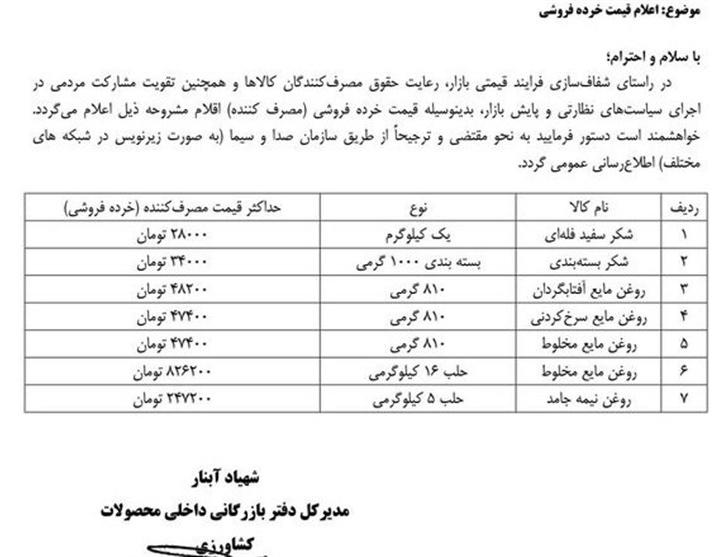به گزارش خبرگزاری تسنیم، مدیرکل دفتر بازرگانی داخلی وزارت جهاد کشاورزی طی نامه ای در راستای شفاف سازی فرآیند قیمتی بازار، رعایت حقوق مصرف کنندگان کالاها و همچنین تقویت مشارکت مردمی در اجرای سیاست های نظارتی و پایش بازار، قیمت خرده فروشی (مصرف کننده) انواع روغن و شکر را به شرح جدول زیر اعلام کرد: