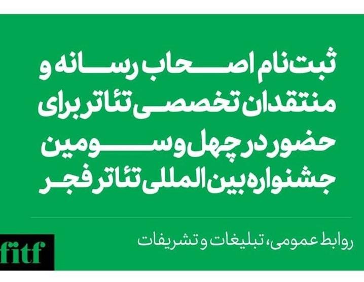 این زمان برای تمام متقاضیان حضور در چهل و سومین جشنواره بینالمللی تئاتر فجر (اصحاب رسانه و منتقدان) غیرقابل تمدید است و به تقاضاهایی که بعد از تاریخ مقرر یا خارج از سامانه جشنواره ارسال شود، ترتیب اثر داده نخواهد شد.