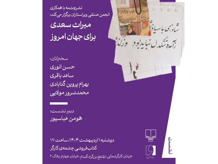 نشست «میراث سعدی برای جهان امروز» عصر امروز دوشنبه یکم اردیبهشت ساعت ۱۷ در کتابفروشی چشمه کارگر واقع در تهران، خیابان کارگر شمالی، تقاطع بزرگراه گمنام، خیابان چهارم پلاک ۲ برگزار میشود.