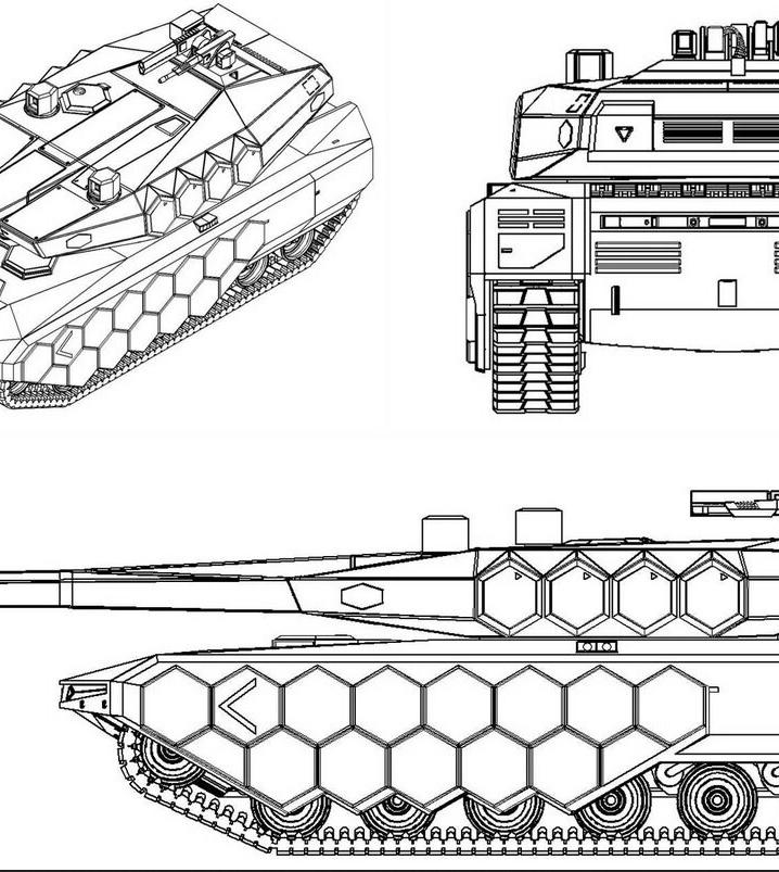 طراحی ثبتشده در بر گیرنده نُه نقشه است که تانک را از زاویههای مختلف شامل نمای ایزومتریک، تصاویر اورتوگرافیک و نمای بزرگتری از جلو و عقب نشان میدهد. مواد استفادهشده در طراحی از جنس فلز یا رزین مصنوعی هستند و شکل پنهانکاری آیندهنگری برای انجام مأموریتهای رزمی در شرایط میدانی برای آن تعیینشده. در این طراحی در مقایسه با نسخه سال قبل، برجک کمی سادهتر به نظر میرسد.