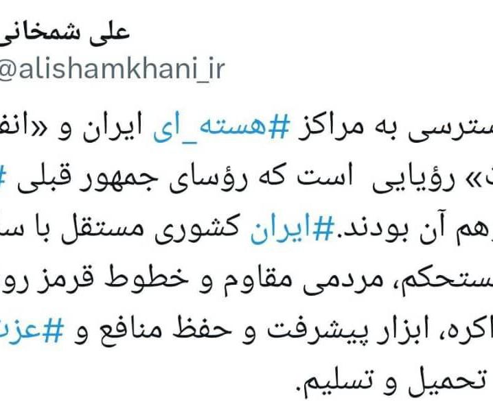 علی شمخانی در واکنش به سخنان ترامپ نوشت: مذاکره، ابزار پیشرفت و حفظ منافع و عزت ملی است؛ نه تحمیل و تسلیم.