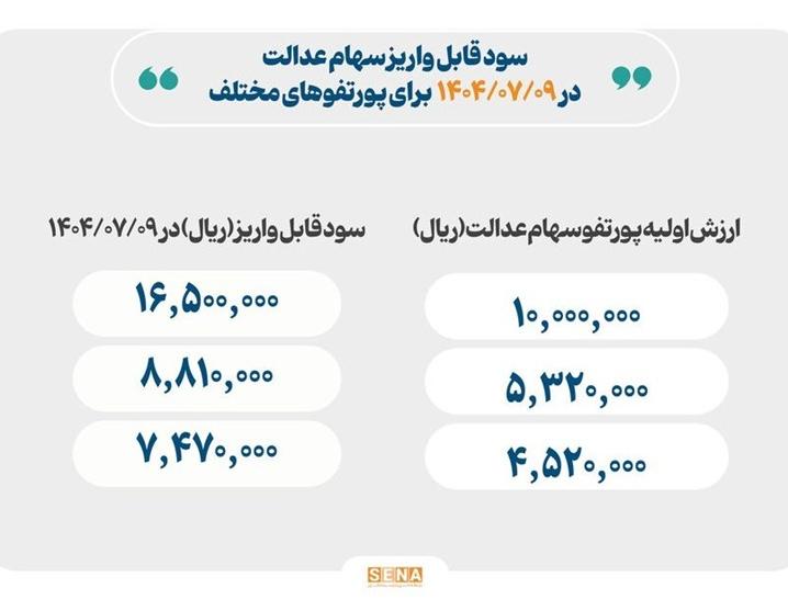 رئیس سازمان بورس و اوراق بهادار با بیان اینکه مبلغ سود پرداختی به سهامداران عدالت به دلیل واریز سود سنوات قبل و یا سود متوفیان به وراث آنها متفاوت خواهد بود، گفت: دارندگان سبد سهام عدالت 452 هزار تومانی مبلغ 747 هزار تومان، 532 هزار تومانی مبلغ 881 هزار تومان و سبد سهام یک میلیون تومانی مبلغ یک میلیون و 650 هزار تومان سود دریافت خواهند کرد.