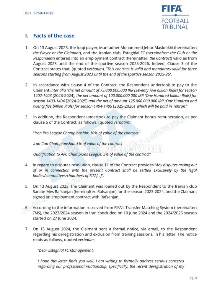 این نامه در ادامه مکاتبه مورخ ۱۵ اوت ۲۰۲۴ درباره لغو ثبت وضعیت من به عنوان بازیکن حرفهای برای فصل ۲۰۲۵-۲۰۲۴ ارسال میشود. قرارداد ما از تاریخ ۱۳ اوت ۲۰۲۴ آغاز شده است. به اطلاع من رسیده که باشگاه شما پنج بازیکن خارجی را ثبت کرده است که این تعداد حداکثر سهمیه مجاز طبق مقررات فدراسیون فوتبال ایران است. بازیکنان خارجی ثبتشده عبارتند از: رافائل سیلوا، دیدیه اندونگ، گائل کاکوتا، جلالالدین ماشاریپوف و گوستاوو بلانکو لشچوک که همگی طی سه هفته اخیر در لیگ برتر ایران به میدان رفتهاند. بر اساس مقررات فدراسیون فوتبال ایران تنها پنج بازیکن خارجی میتوانند ثبت شوند، بنابراین وضعیت فعلی من نامشخص است.