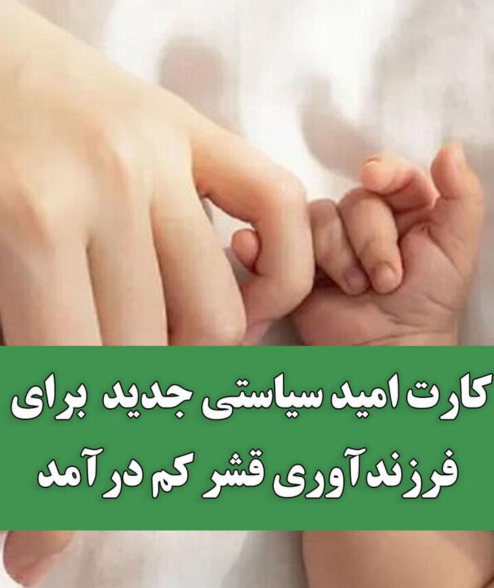 کارت امید سیاستی جدید برای فرزندآوری قشر کم درآمد اقتصاد ایران: تا 25سال آینده تقریبا 26درصد جمعیت کشور را سالمندان تشکیل می‌دهند و اگر از امروز به فکر افزایش جمعیت نباشیم در 25سال آینده جوانان پویا و فعالی که باید در بخش تولید فعال باشند و بیمه پرداخت کنند تا صندوق‌های بیمه‌گر بتوانند مستمری بازنشستگان و سالمندان را پرداخت کنند، وجود نخواهد داشت و این حداقل چالشی خواهد بود که ما درصورت بی‌توجهی به ترکیب جمعیتی با آن روبه‌رو خواهیم بود.