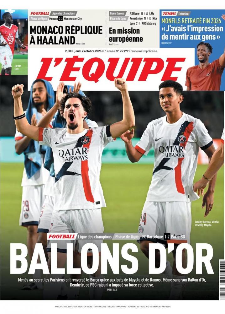 ورزش سه: تیتر «توپهای طلا» برای پایان دادن به هرگونه بحث بین پاریسیها و او انتخاب شده است. فرانسه پیروزی پاریسنژرمن را ستود و در عین حال پیامهای متعددی به بارسلونا فرستاد؛ یکی مستقیم از ویتینیا به پدری و لامین به خاطر اظهارات پیش از بازی و برخی غیرمستقیم مانند تیتر صفحه اول اکیپ.
