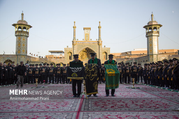 این آیین معنوی با حضور خادمان آستان قدس رضوی، مسجد مقدس جمکران و امامزاده موسی مبرقع همراه بود که همگی با شالهای مشکی و لباس خادمی به نشانه ارادت و همبستگی در مراسم حضور داشتند و در لحظه تعویض پرچم در کنار خادمان حضرت معصومه (س) ایستادند.